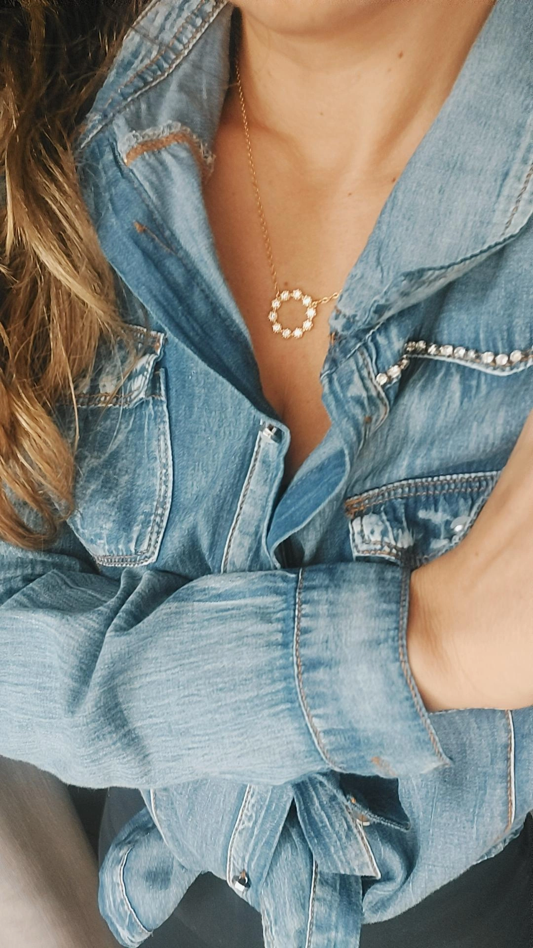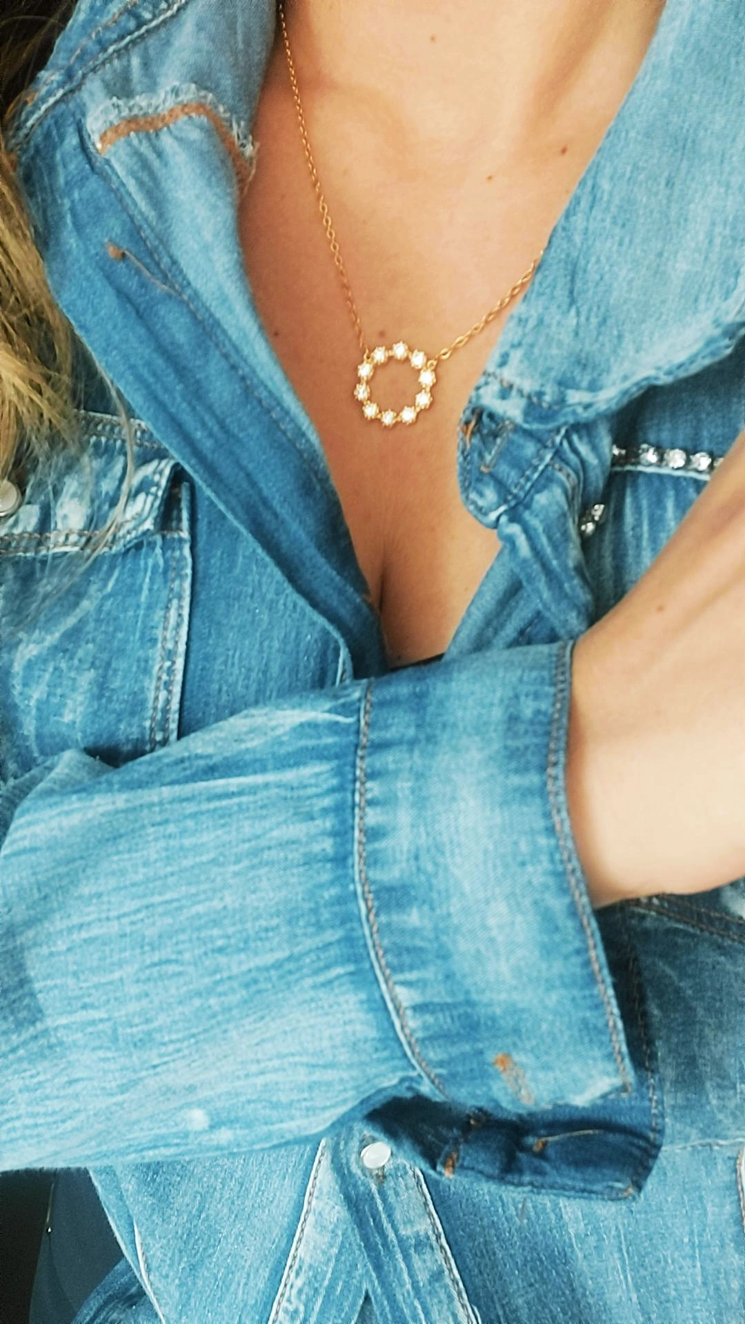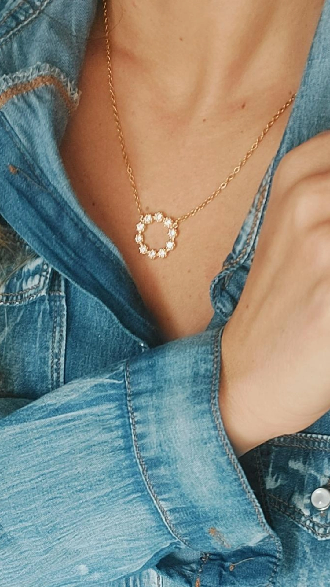 Colar círculo cravejado em zircônias, banhado em ouro amarelo 18k.