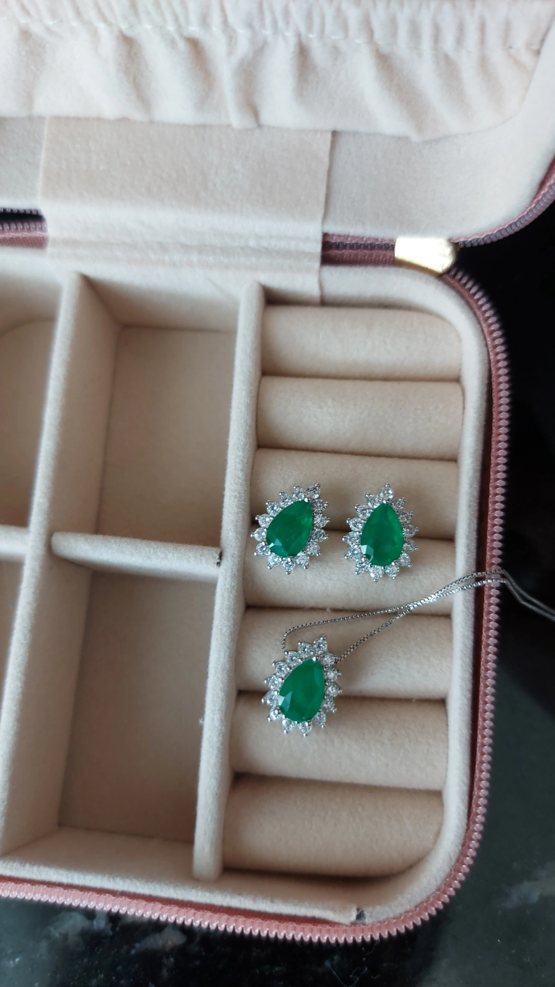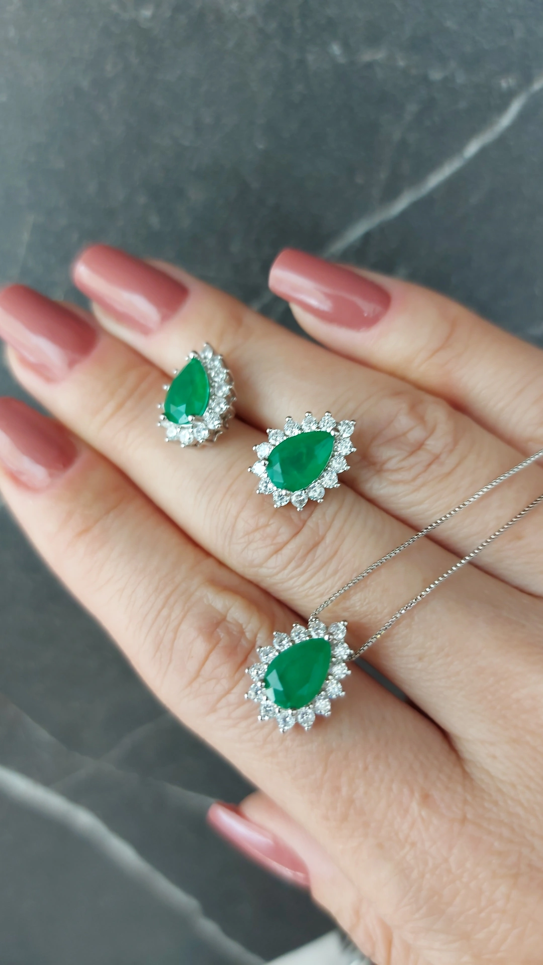 Conjunto gota cravejado em zircônias, cor verde esmeralda.