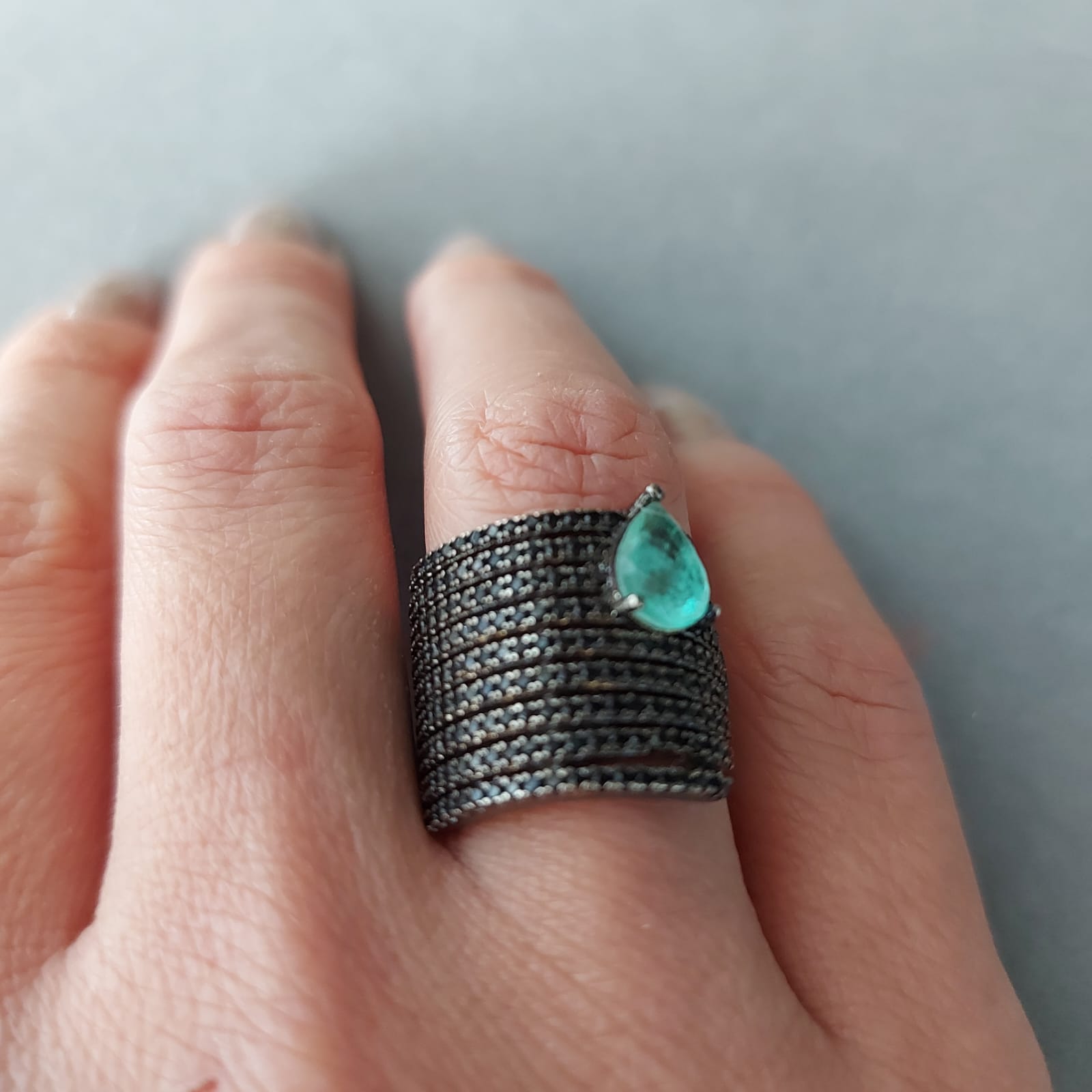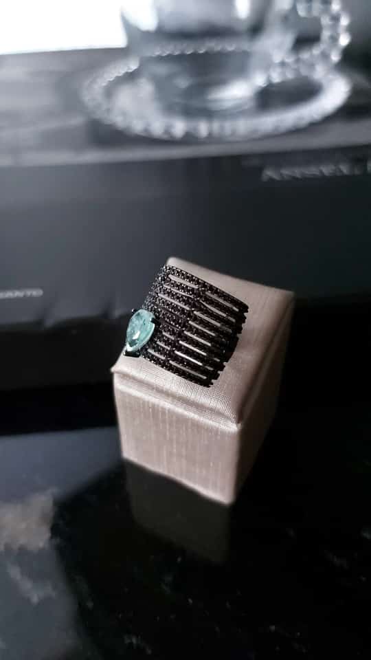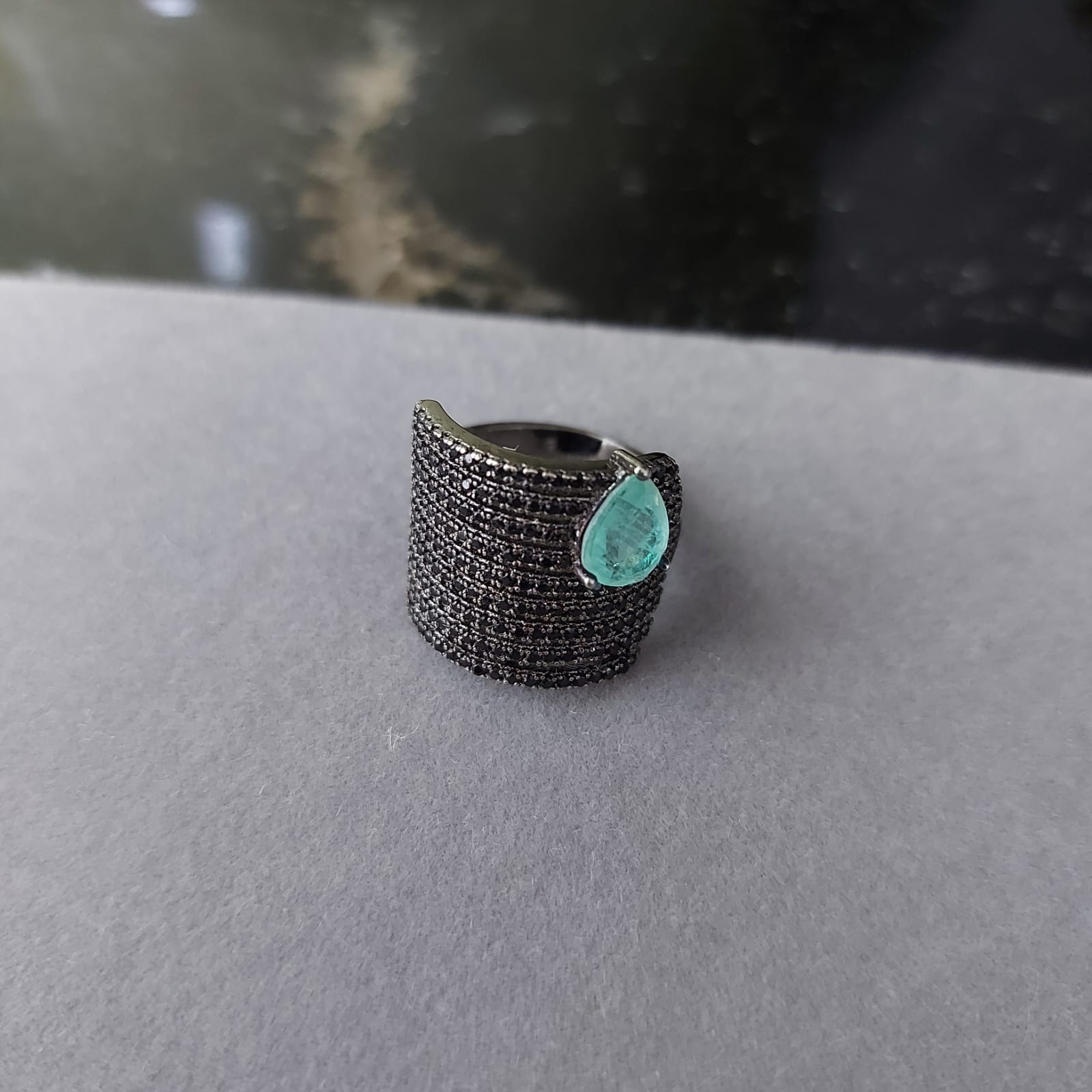 Semijoia - Anel Ródio Negro com micro zincônias negras. Gota verde fusion.