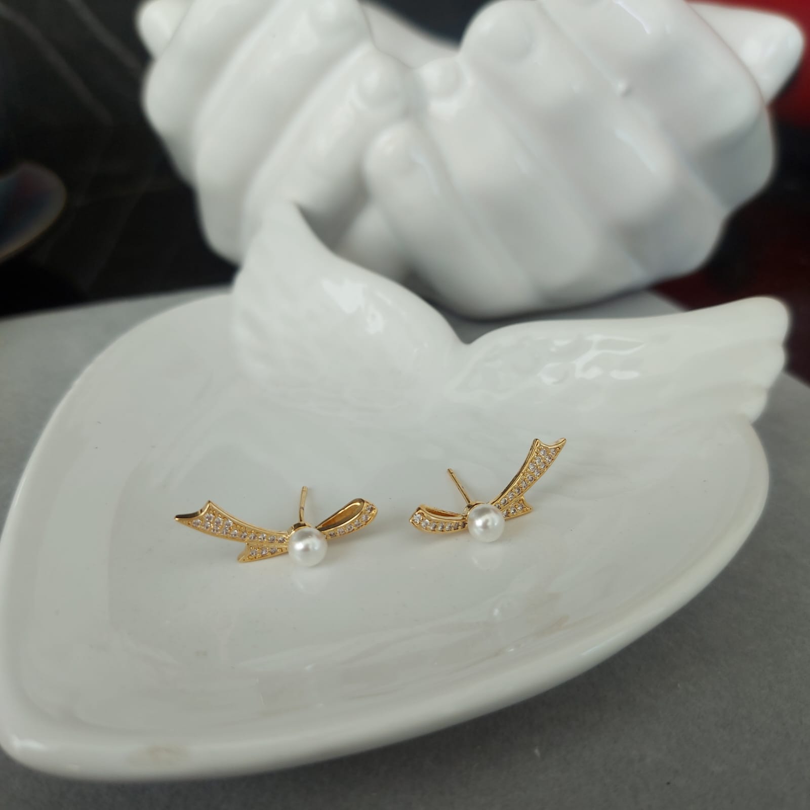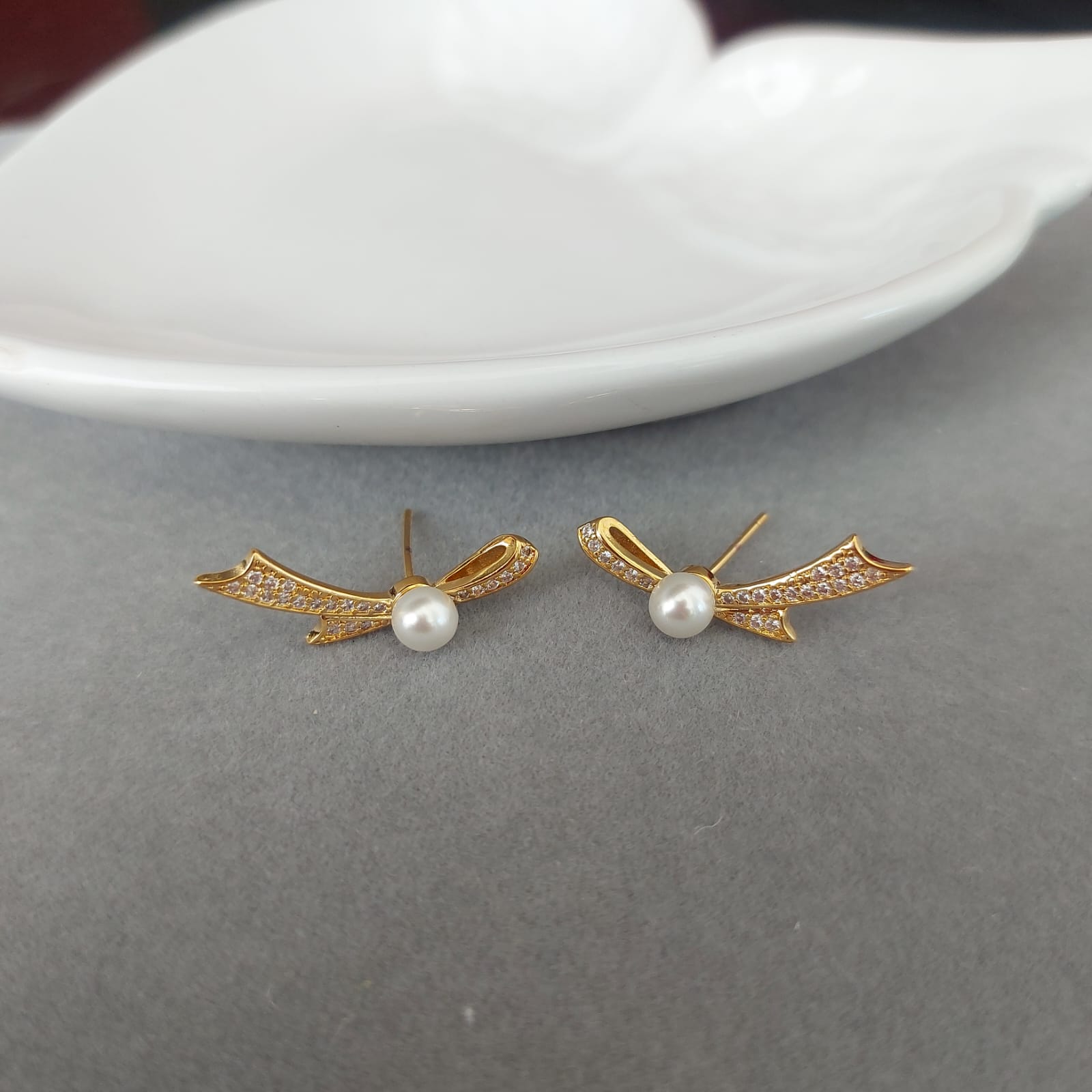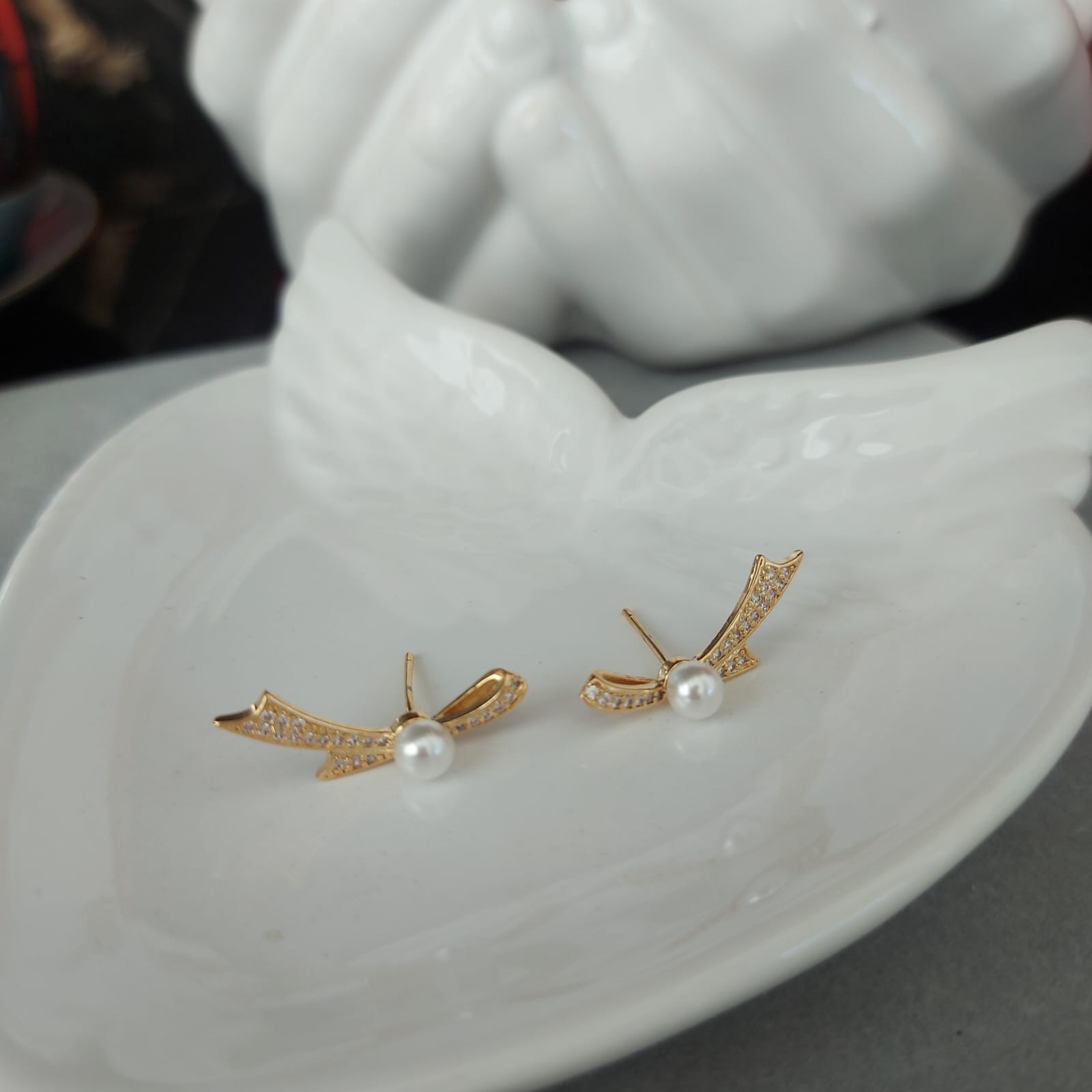 Semijoias: Brinco laço cravejado com micro zircônia e pérola shell banhado em ouro 18k.