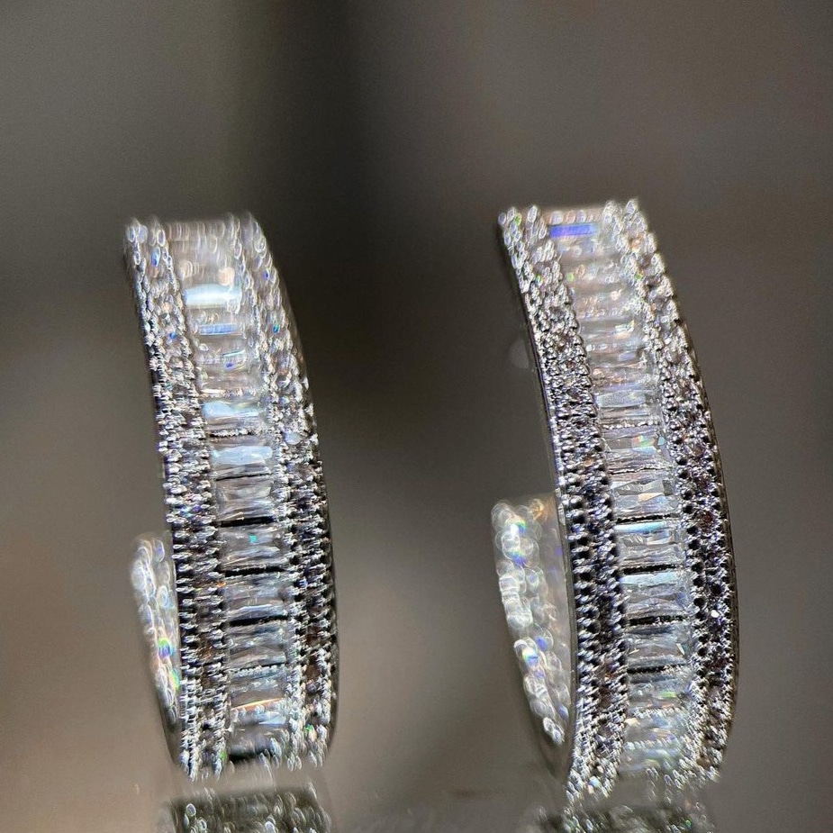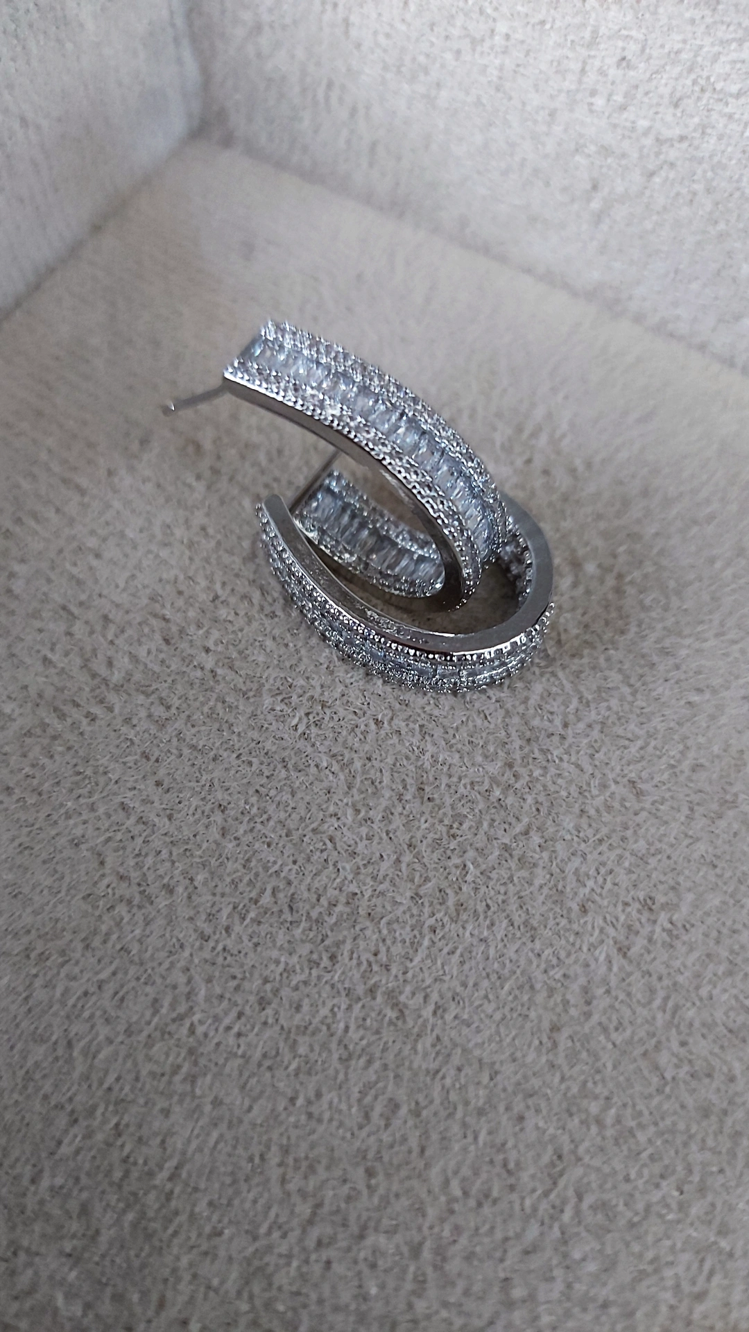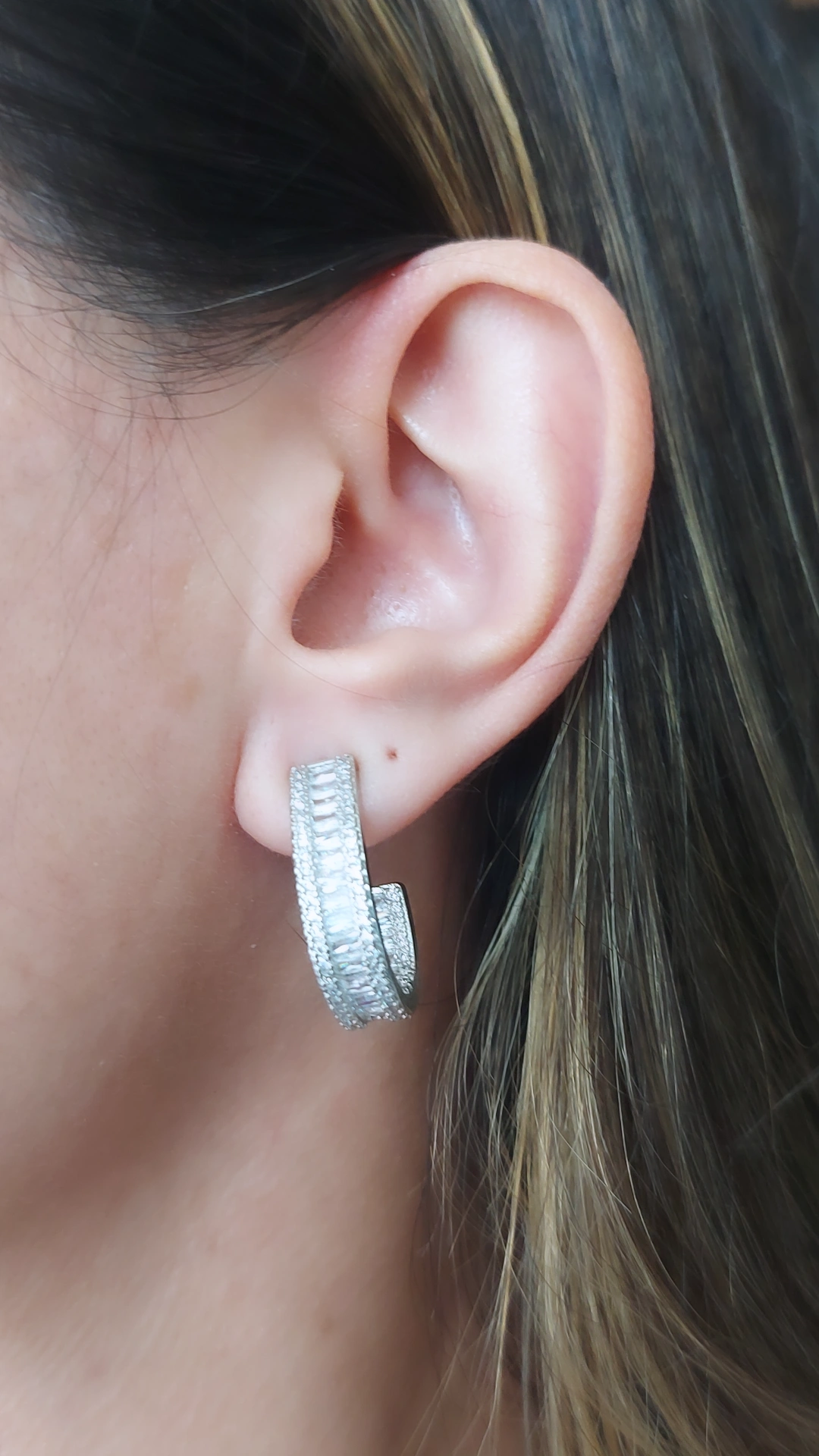 Brinco meia lua todo cravejado em zircônias, banhado em ródio branco.