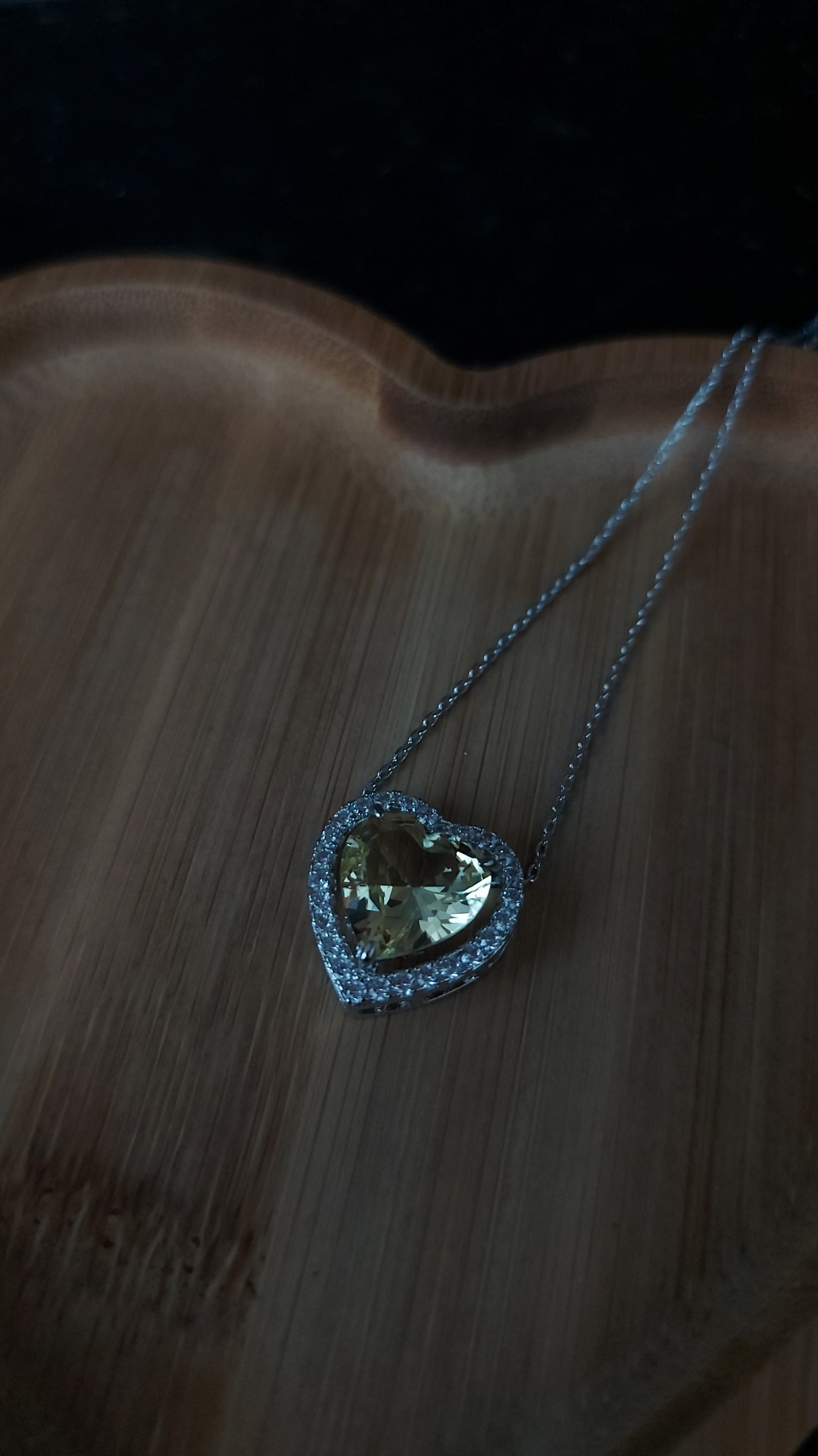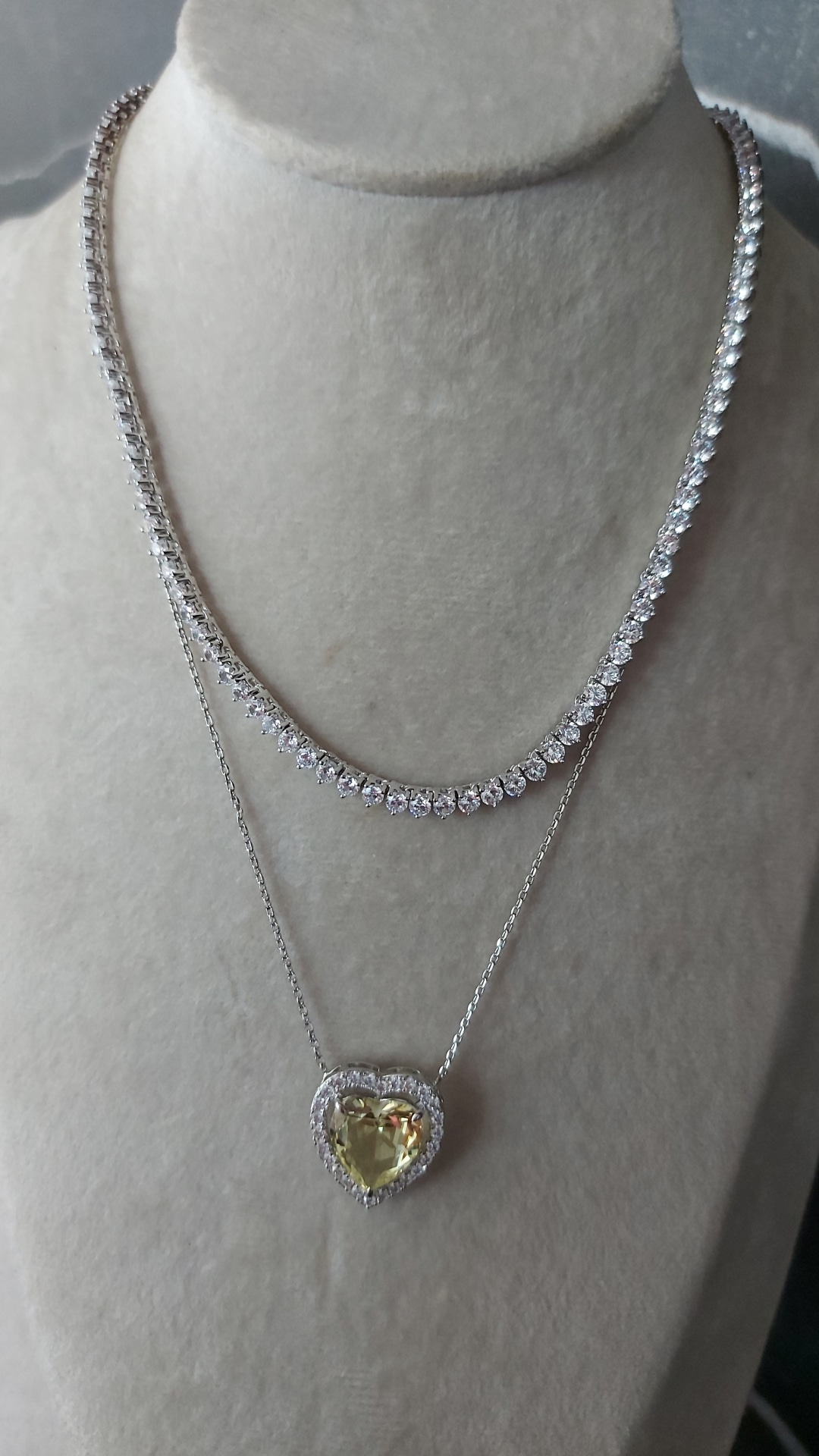 Colar curto banhado em ródio branco ,com pingente de coração com cravação de zircônias na cor branco (cristal) e cristal fusion na cor amarelo (citrino).