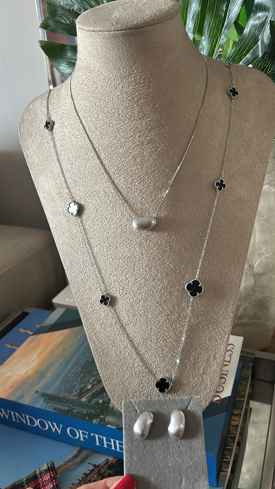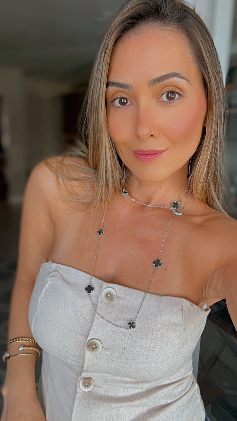 Colar trevos esmaltados pretos banhado em ródio branco .