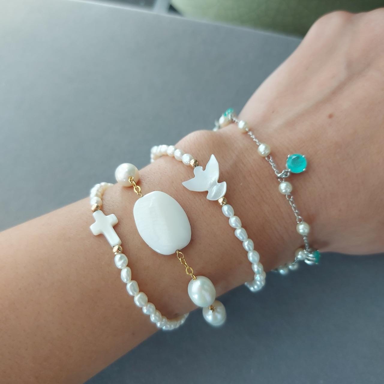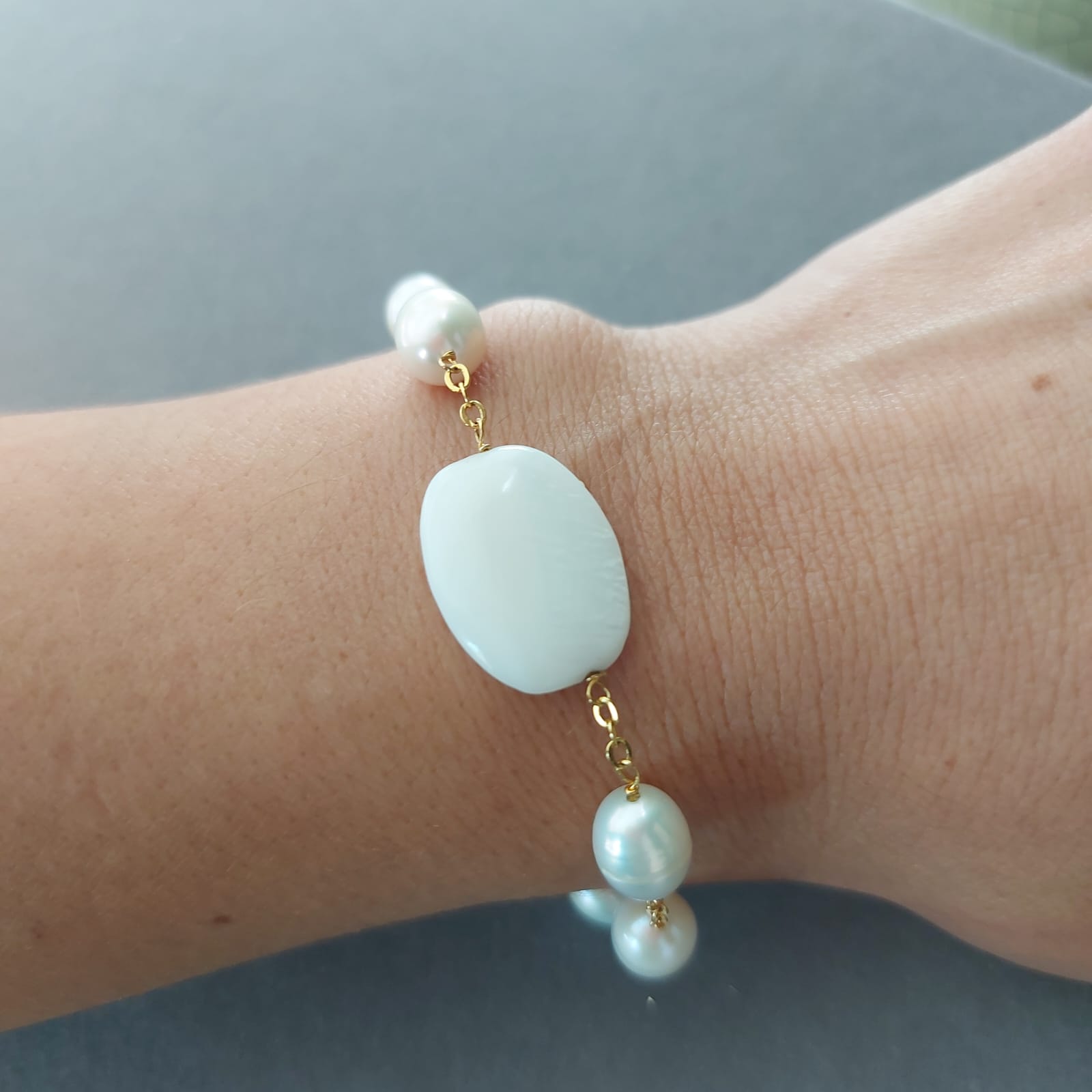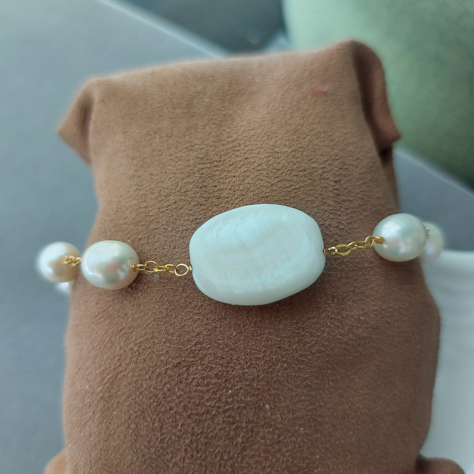 Semijoias: Pulseira Contrapinada pérolas e madréperola no meio.