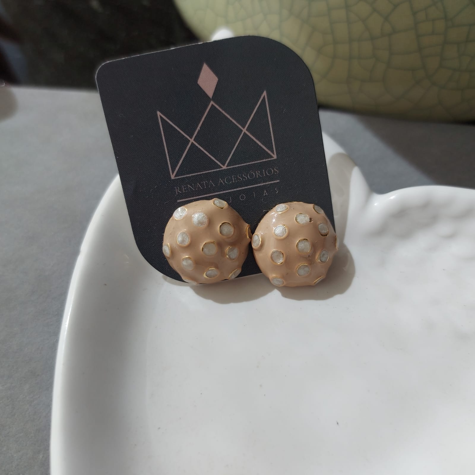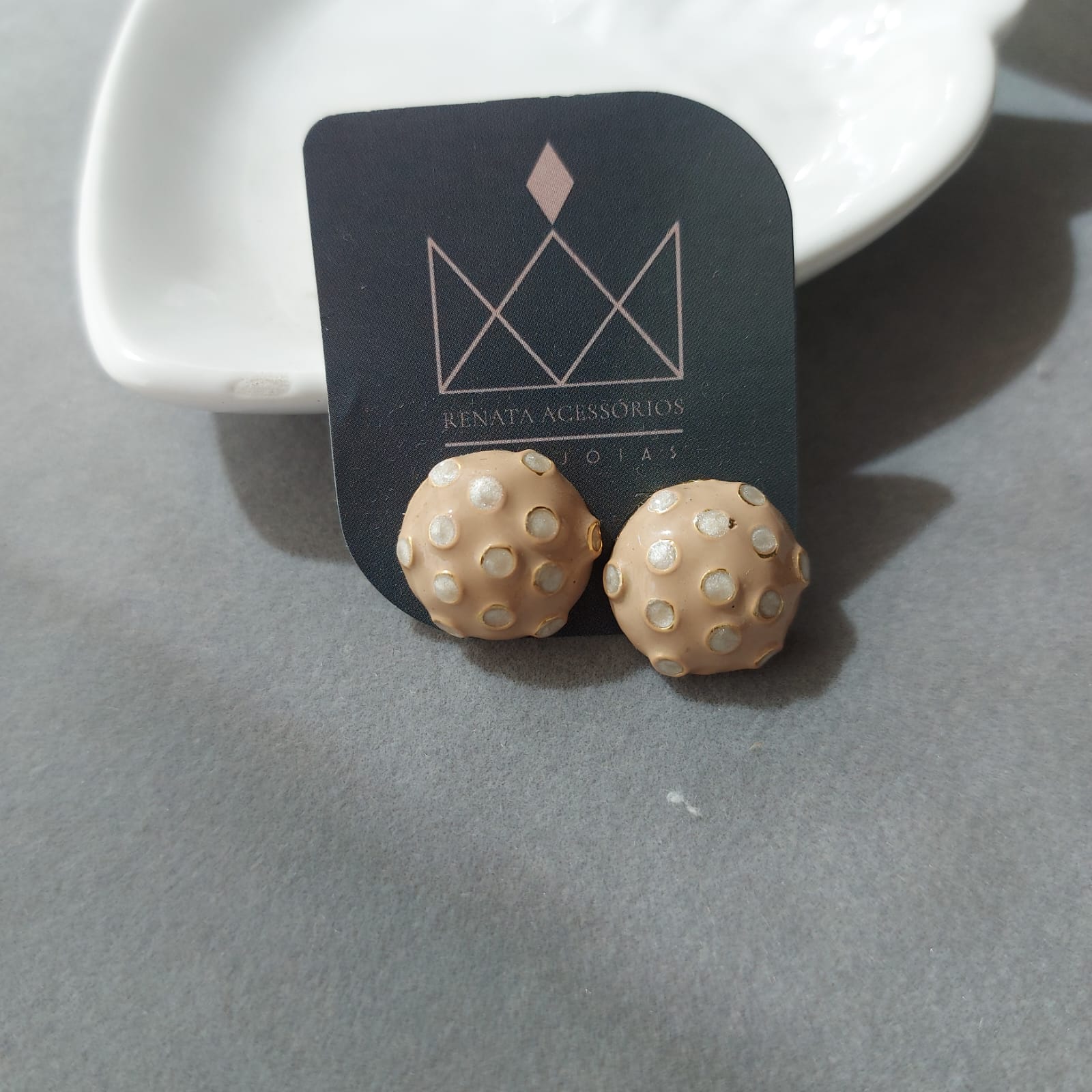 Semijoias: Brinco esmaltado bege banhado em ouro 18k.