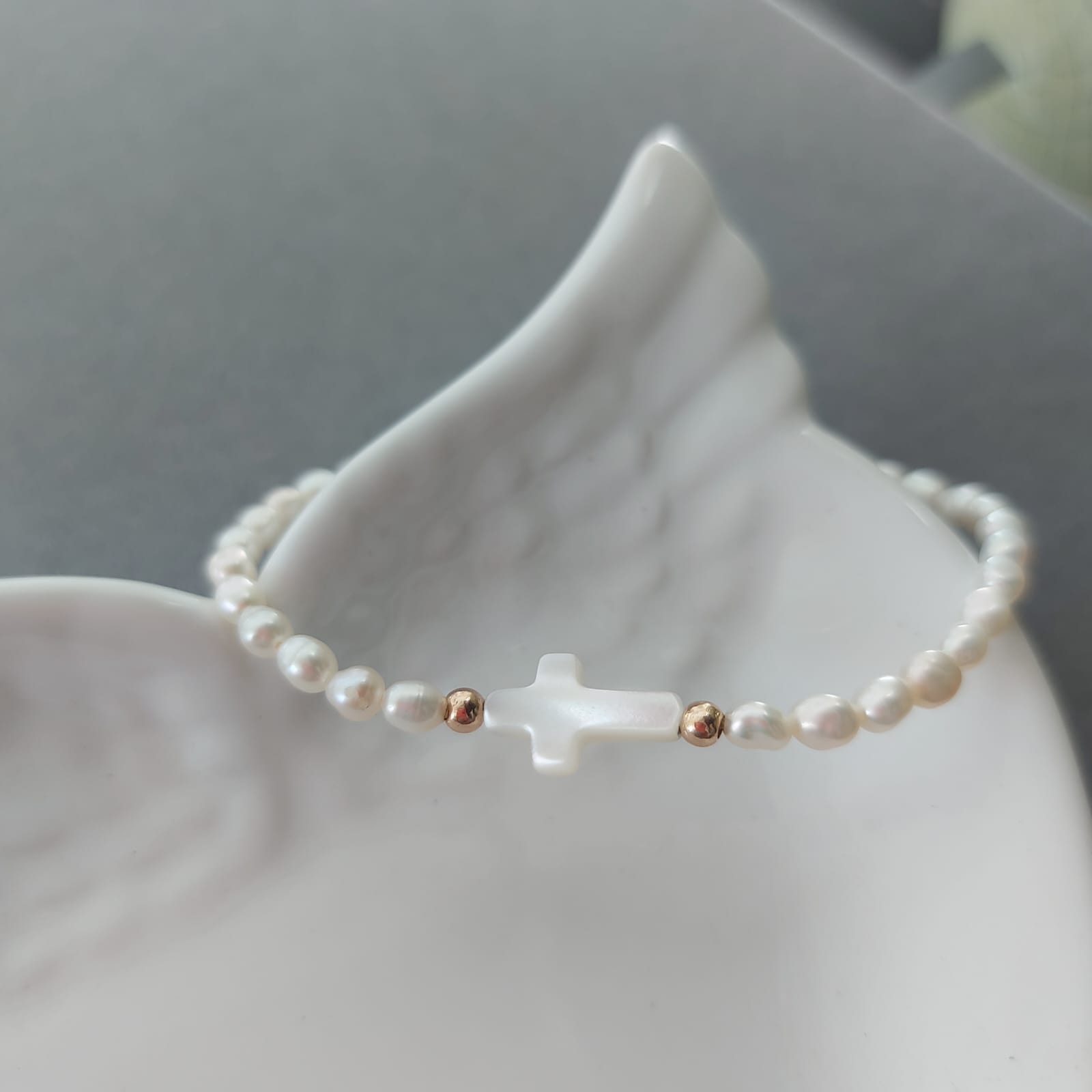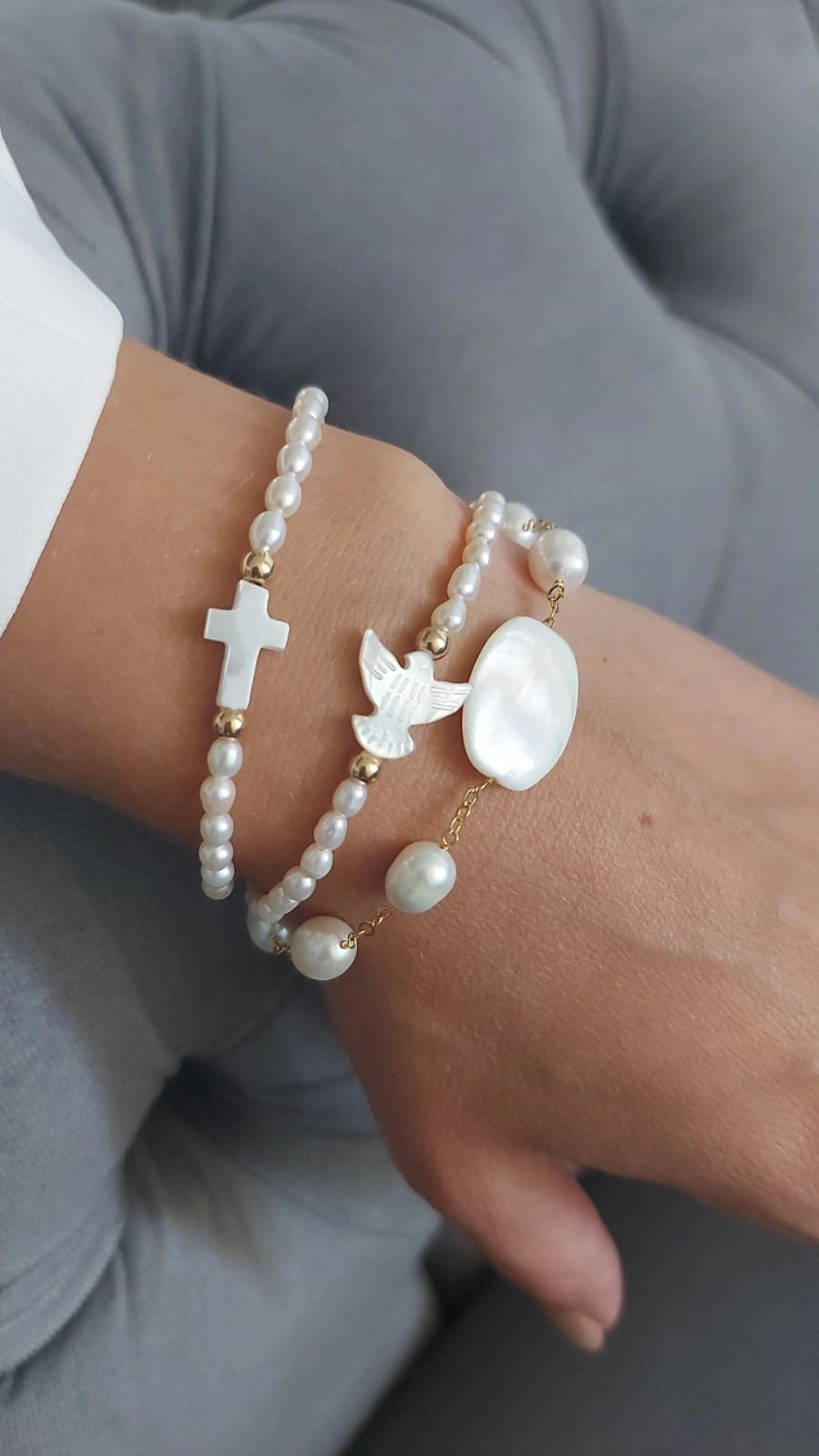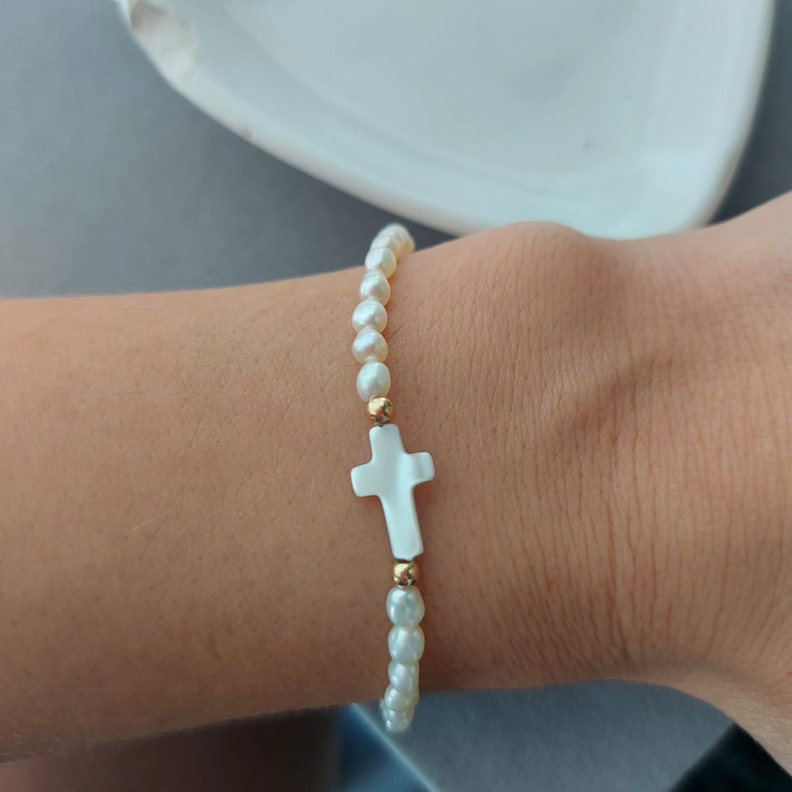 Semijoiias: Pulseira pérola arroz com pingente em madrepérola cruz.