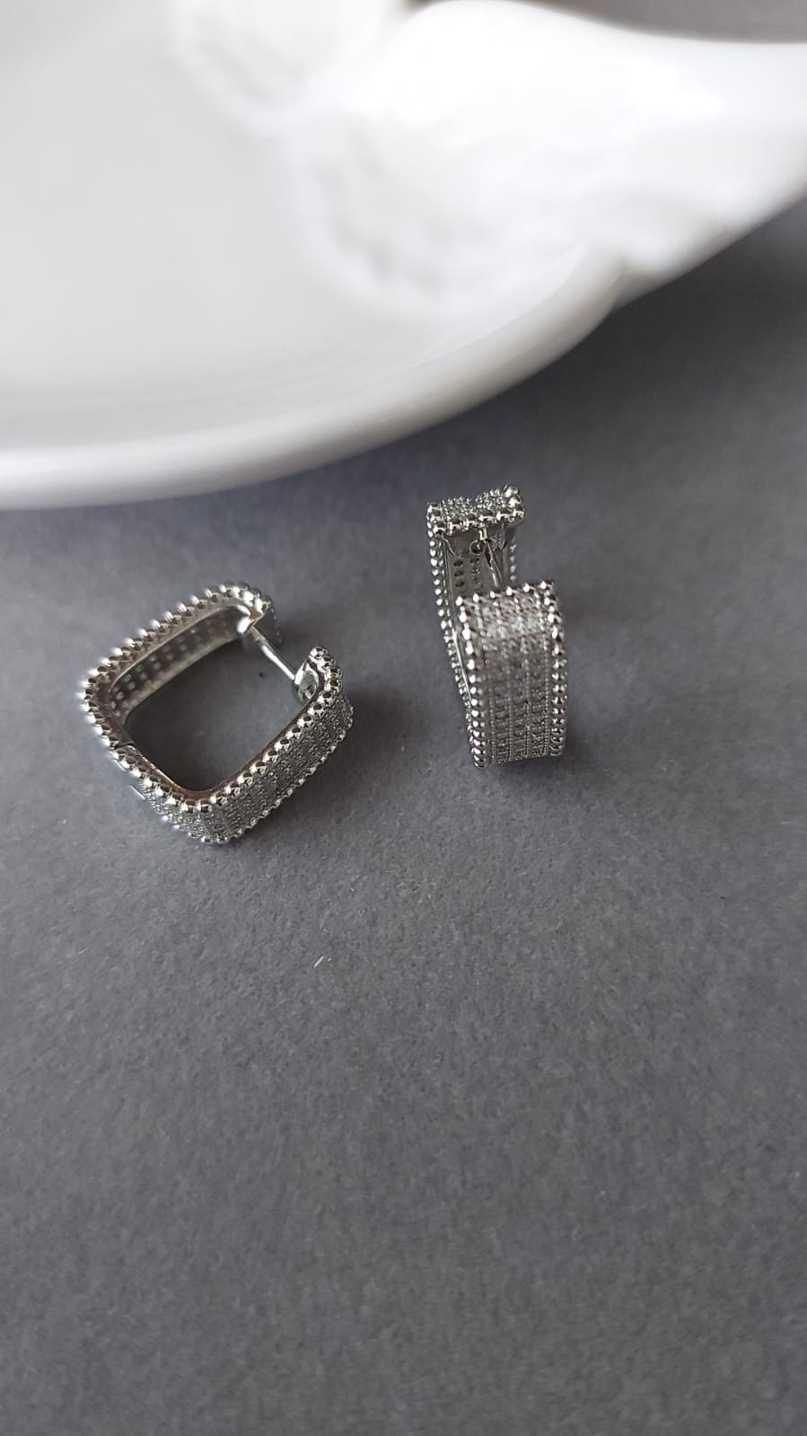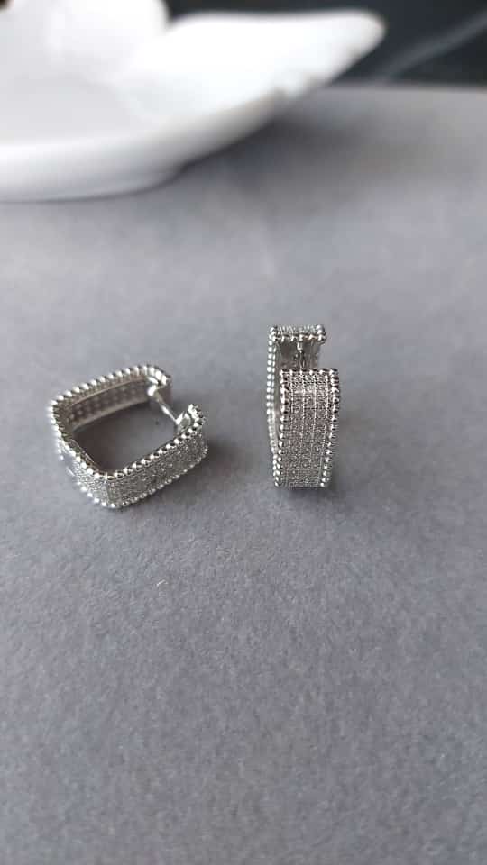 Semijoia - Brinco Argola Quadrada Cravejada Confeccionada em Banho Ródio Branco.