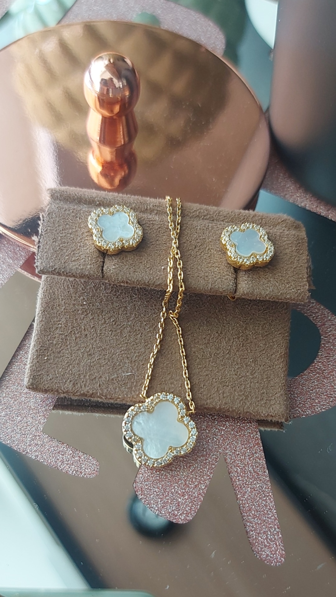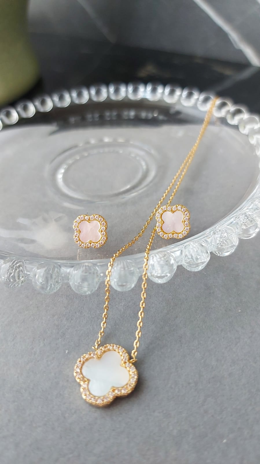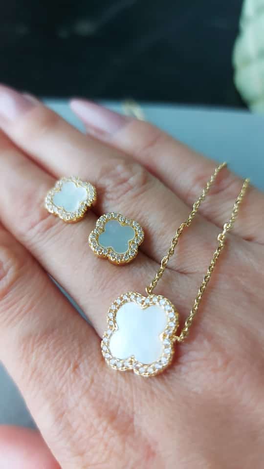 Semijoias: conjunto flor madrepérola cravejado em micro zircônias banhado em ouro 18k.